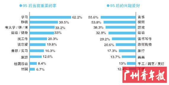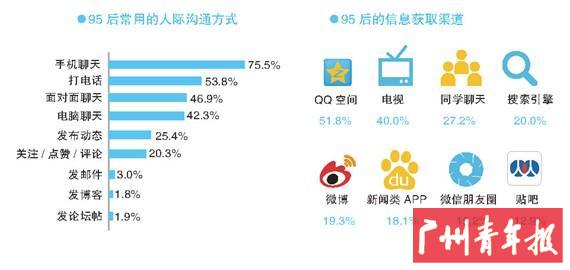 在社交方面,对于95后来说,手机聊天是最重要的沟通方式,以75.5%的得票率高居第一,往下依次是打电话、面对面聊天、电脑聊天,位居最末的则是发博客和发论坛帖。而相比于95前更倾向于使用微信和微博,95后则更喜欢QQ空间。调查反映,95后的信息获取渠道,首位是QQ空间,其次是电视和同学聊天,微博和微信朋友圈仅分别居第五和第七位。