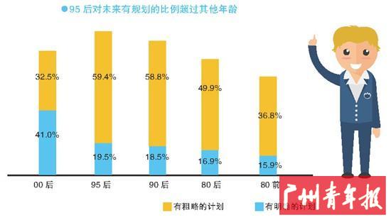 而相比于认为95后非常幼稚这一观点,MUX用户研究组的调查表明似乎并非如此,78.9%的95后对自己的未来有规划,这一比例远超其他年龄层次。95后对生活有清晰明确的规划,兼顾短期与长期、理想与现实,19.5%的95后对未来有明确规划,59.4%的95后对自己的未来有粗略规划。
