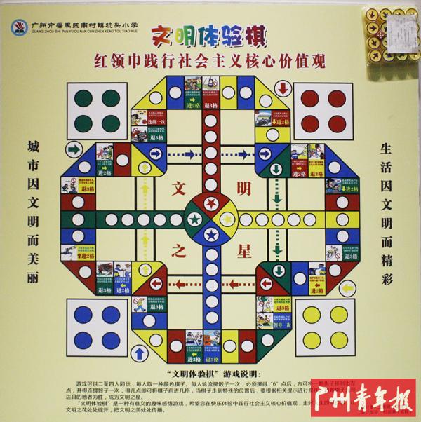 观展厅内,番禺区南村镇坑头小学王紫妍同学设计的“文明体验棋”格外醒目,它巧妙借用了“飞行棋”玩法,并融入“文明出行”、“和谐礼让”、“爱护公物”等价值取向,寓教于乐的创意让人拍案叫绝。广州市美术中学高三学生蔡佳由创作的《富强之路》,获得中学组一等奖。据她介绍,这幅绘画作品凝聚了自己对核心价值观的思考,用刮蜡纸、彩色铅笔和马克笔绘制出不同的元素——以幸运数字3、带有爱心的扑克牌等代表“文化”,以工业化的齿轮寓意“经济”,而“文化和经济上的共同繁荣,才能形成真正的国家富强。”
