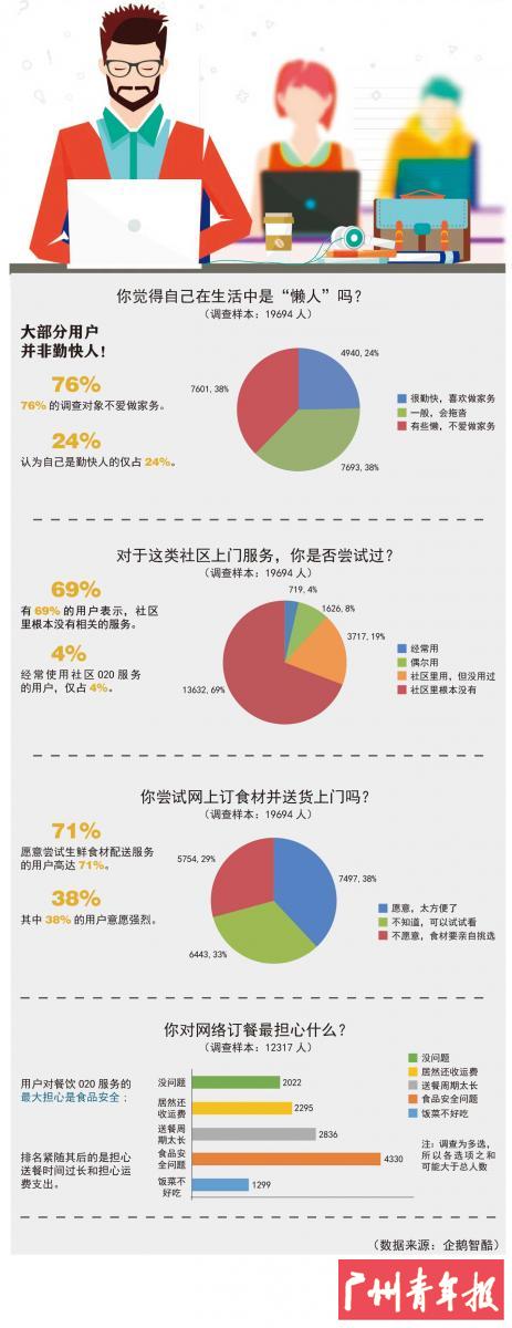针对这一现象,记者在网上发起了一项关于广州青年对“懒人经济”依赖程度的问卷调查,相关数据调查显示,在18-24岁的青年人中,97.22%的人有网购或预订上门服务的经历,其中超过50%的人每月网购的次数在3次以上,餐饮外卖、生活用品、书籍等成为他们的主要购买的商品。