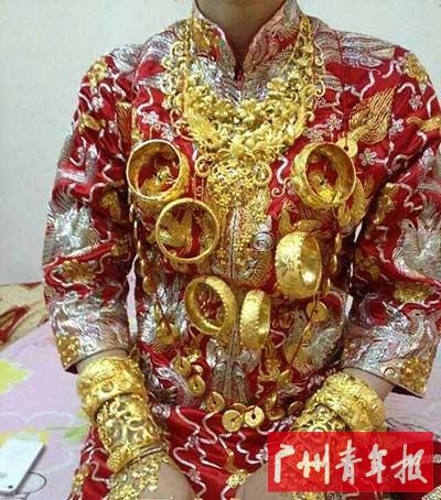 90后的白领林平去年结婚,家里买了一些黄金做聘礼。林平还有个弟弟,当初买黄金便计划留一半给弟弟结婚时用。考虑到只戴一半显然不够撑场面,婆家便和林平的未婚妻商量:结婚当天,她把所有黄金都戴上,等嫁过来后,再还一半给婆家。林平的未婚妻结婚当天所戴的金饰虽然一半是未来弟媳的,但好歹算自家财产。还有一些人,结婚当天会向姑、姨、婶等亲戚借金饰戴上以撑门面,婚礼一结束就还。