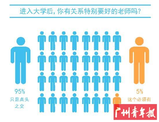 “老师站在讲台一侧自己讲自己的,学生坐在下面自己做自己的,沟通和交流几乎少得可怜”,广东药学院的程同学向我们描述了平常上课的场景,但她觉得这并没有什么,反而是“一种普遍的现象”。我们对此做过一个小调查,调查的结果与程同学的说法不谋而合。在我们调查过的所有高校学生中,95%的人表示自己在大学里没有关系特别要好的老师,除了上课之外,基本没与老师接触过,更别说沟通和交流了;另外,有70%的学生认为,即使自己在生活中遇到了难题也不会主动找老师进行咨询,无论是学习方面的问题还是生活中遇到的困难;而在被问到“大学里与老师处好关系重不重要”的问题时,60%的学生给出了“一般”的答案。这一连串的数字似乎表明,学生与老师“不太熟,只是点头之交”已成常态,那么,是什么造成大学生与老师之间这种进退两难而又矛盾的处境