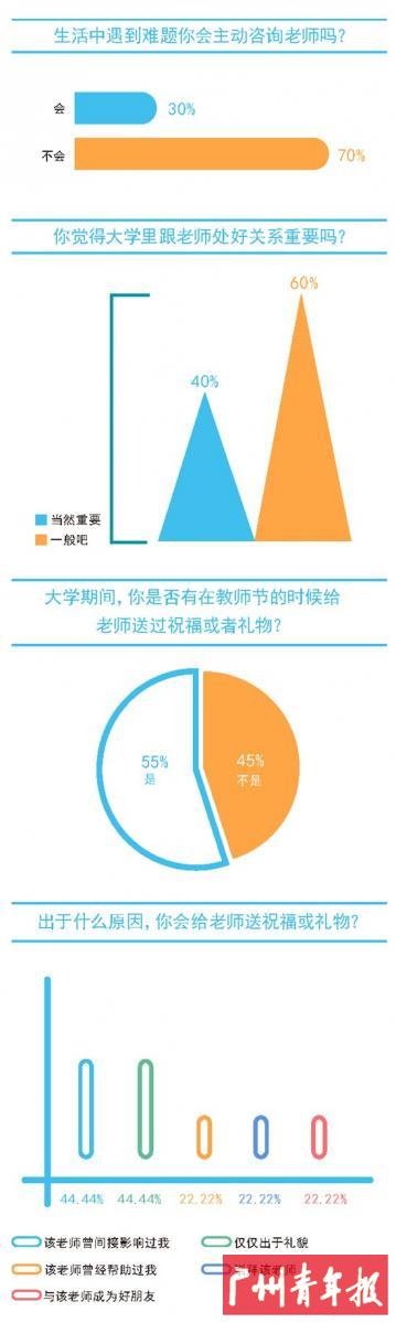教师节即将来临,在调查过的学生中,仅有25%的人打算给老师送礼物或者祝福;但现在也有不少学生以团体的形式通过新媒体制作视频、微信推送的方式集体向老师表达祝福。在这样一种环境下,师生情的培养到底要用多少时间?这个问题我们都没有答案。但可以肯定的是,师生关系的培养绝不能单靠其中任何一方,需要的是学生与老师的共同配合与经营。