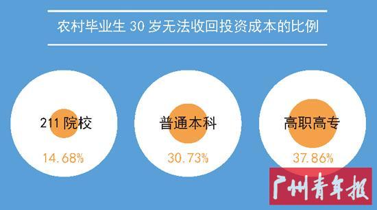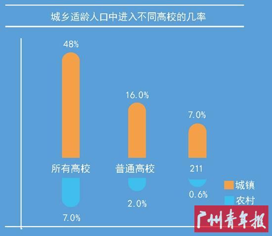 还有一部分人认为读大学不如直接选择技工学校,学门手艺和技术,也能找份稳定待遇好的工作。然而根据调查显示,情况并不是那么乐观,在投资回报率上,本科是高中的8倍以上,中专和高专则相差不远,比本科低14%。其中,毕业于211类院校的农村毕业生, 85%的人在30岁前能收回投资成本。高等教育对于贫困的农村学生来说,仍是改变命运最好的方式,只是这条路越来越难走了。调查中发现,农村适龄人口进入211院校的几率仅为0.6%,在城市这一数据为7%,为农村的11倍。这是对农村地区教育投入严重不足的弊病,再加上高校招生制度也明显地偏向城市学生,所以农村学生要付出比城市同龄人更多的努力才能换来平起平坐的权利。