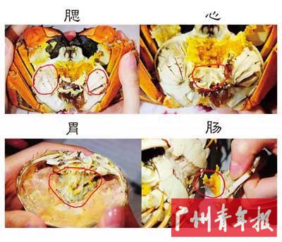 姚深告诉记者,先用一口大锅,烧滚水,火大水多。接着将绑好的蟹投入,等水再煮沸,四两的蟹计时七至八分钟,五两则追加一分钟。同时把装蟹盘子烫热备用,微波炉热几分钟也行。取蟹时不要关火,仍然保持最大的火力,用夹子夹出螃蟹放到预热好的盘子中,连盘带蟹置于干燥处。因为盘子跟螃蟹都保持高温,蟹体内外的多余水分会迅速蒸发掉,吃的时候蟹壳发脆,与肉分离,才好剥开。他同时提醒,大闸蟹的腮、心、胃和肠四个部位不能食用。