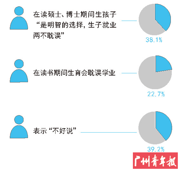 中国青年报曾对“读书期间该不该生子”进行过调查,38.1%的受访者认为,在读硕士、博士期间生孩子“是明智的选择,生子就业两不耽误”;22.7%的人觉得,在读书期间生育会耽误学业;39.2%的人表示“不好说”。可以看到,还是有相当大的一部分人认同在读博或者读研期间结婚生子,“妈妈研究生”已经不再罕见。北师大校医院的某负责人表示,在校结婚生子的研究生大致是稳中有升,在校研究生被纳入到学校的计生工作中,每个研究生入学时都要填写婚育情况表,方便统计和管理。
