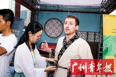在五彩“Jazz”字样的映衬下,一袭汉服、一床古琴,演奏者轻拢慢捻抹复挑,让现场流动着充满禅意的乐音。还有琵琶合奏《彝族舞曲》、古风吟诵《长恨歌》等经典曲目,精妙绝伦的演出让在场的市民都陶醉在音乐的海洋中,流连忘返。而在特色摊位锦绣坊前,则围满了对汉服感兴趣的朋友,不少青年还在现场试穿汉服。一位女士第一次穿上精美的汉服,裙裾飘飘,感觉非常新鲜,忍不住用相机留下自己的翩翩倩影。“我们想通过这些互动活动让大家了解汉服汉礼背后的文化传统,唤起公众对博大精深的汉文化的热情。”广州市汉民族传统文化交流协会负责人告诉记者。