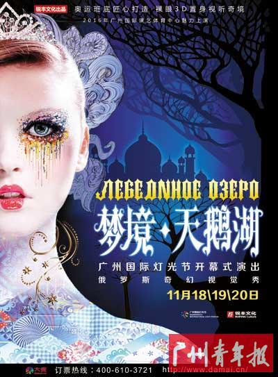 本报讯(记者 龙金莲)2016广州国际灯光节的开幕式表演《梦境•天鹅湖》将于11月18日晚20:00起在广州国际体育演艺中心连演三晚。声、光、影、水、雾、烟、互动带来7D奇幻体验视觉秀,钢琴演奏、摇滚、杂技、芭蕾、人屏互动秀等八大艺术形式结合,此场演出将超乎想象。