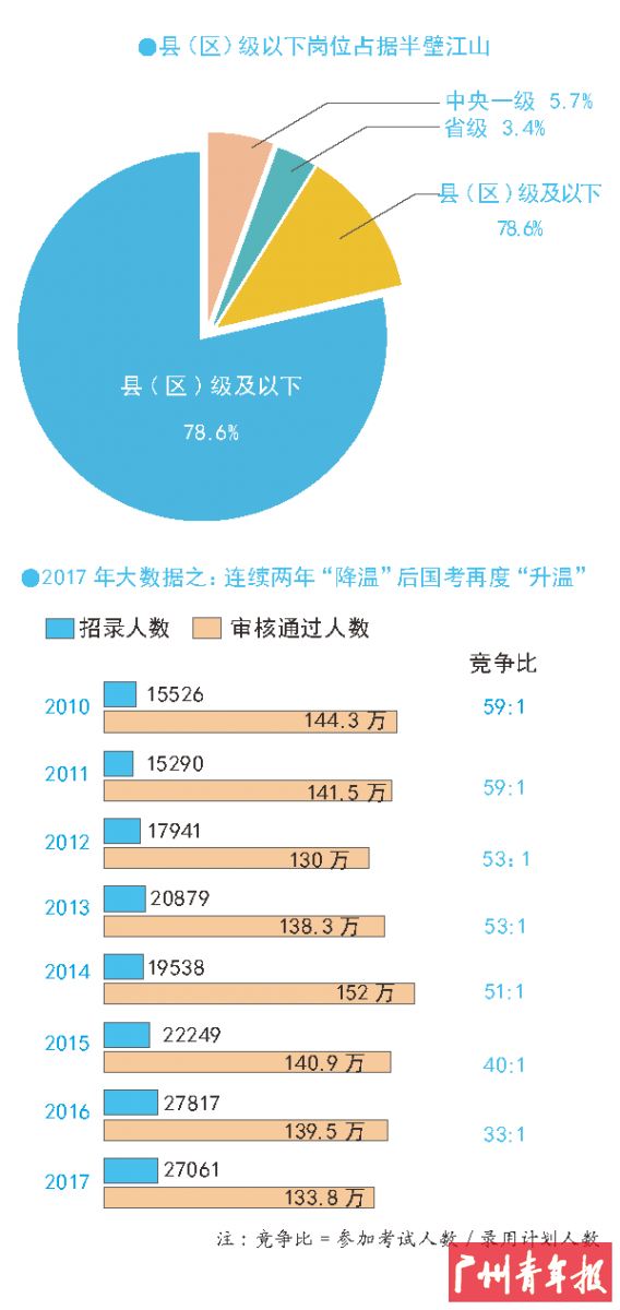 10月24日18时,如火如荼的2017国家公务员考试报名落幕。根据国家公务员局数据显示,共有211.5万人报名,其中148.63万人通过了用人单位的资格审查,较去年的139.46万人增加了9.17万,同比增加6.58%,连续两年“降温”后又再度“升温”。