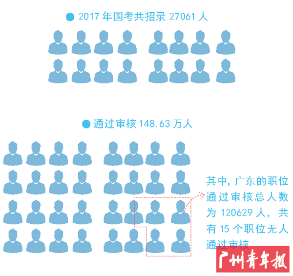 据广东中公教育统计,截至24日18时,2017国考招录职位中工作地点在广东的职位通过审核总人数为120629人,共有15个职位无人通过审核,平均竞争比例为57.5:1。