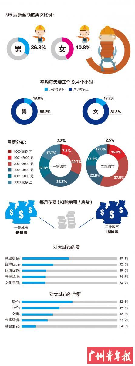 95后新蓝领,是指工作、生活在一、二线城市,为城市日常运转贡献力量的基层工作者。近日,赶集网与数字100市场调研公司联合发布《95后新蓝领现状报告》。报告显示,新蓝领群体收入水平整体偏低,平均薪资为3417元,有公积金的还不到两成。然而工作却一点都不轻松,他们平均每天要工作9.4个小时,仅10.7%拥有双休日。对于工作的城市,大部的95后蓝领表示“又恨又爱”。