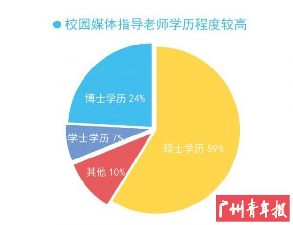 相较于自媒体的单打独斗校媒联盟内部拥有更多的学校官方支援的倾斜,普遍都配有相关的指导老师,且校园媒体指导老师学历程度较高。除9.84%选择其他外,59.38%的指导老师是硕士学历,24.04%的指导老师是博士学历。指导老师中硕士及以上学历占90.52%,比2011年增加10.1%。