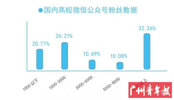 在参与调查的496个微信公众号中,20.77%的粉丝量在1000以下,26.21%校园微信公众号的粉丝量为1000-3000,3000-5000的占10.69%,5000-8000的有10.08%。粉丝量在8000以上的校园微信公众号中,粉丝量在10000-30000的校园微信公众号最为集中,有13.31%;30000-50000的有4.64%;50000-100000的有1.41%。