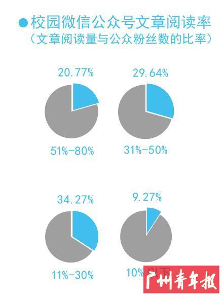 调查显示,校园微信公众号文章阅读率(文章阅读量与公众粉丝数的比率),其中51%-80%的占20.77%;31%-50%的占29.64%,34.27%的在11%-30%,10%以下的有9.27%。