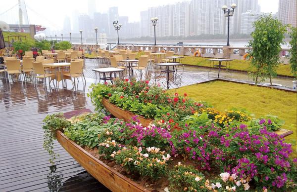 有轨电车站位于酒吧区中西部,紧挨着标志性的巨型红色钢桁架。与其他站点白墙黑字不同,琶醍二字书写在未经打磨的红褐色钢板上,呼应着老工业区粗犷的风格。进入车站区域,近两百米的行车长廊粉刷成白色,尽量减轻压抑感。封闭的顶棚在中间一段换了个节奏,采用玻璃设计,秋日的阳光洒在站台旁。站台临江处,米黄色的石材栏杆换成半人高的落地玻璃,珠江水近在眼前。