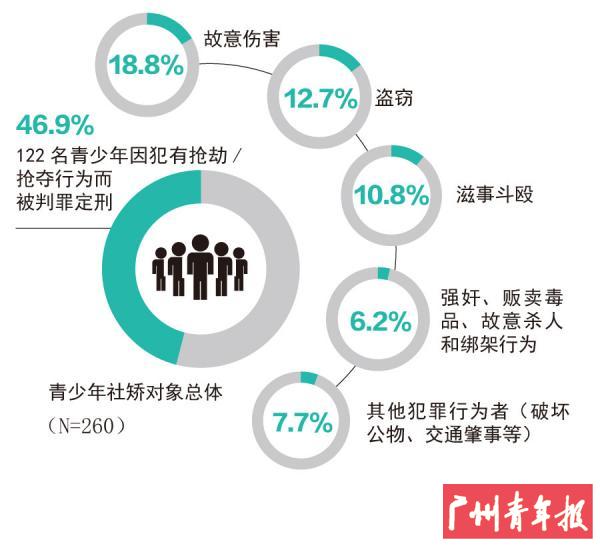 抢劫/抢夺是青少年最为主要的犯罪行为。报告显示,有122名青少年因犯有抢劫/抢夺行为而被判罪定刑,占青少年社矫对象总体的46.9%;其次,故意伤害占18.8%;第三则是盗窃和滋事斗殴,分别占12.7%和10.8%;青少年出现强奸、贩卖毒品、故意杀人和绑架行为,共有16人,占6.2%;出现其他犯罪行为者(破坏公物、交通肇事等),有20人,占7.7%。