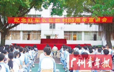 为纪念中国红军长征胜利80周年,由广州市教育局、广州市关心下一代工作委员会、广东省延安精神研究会、广州市延安精神研究会主办的延安精神宣讲活动于10月14日正式启动。本次宣讲团计划走进广州市25所中小学及职业学校,共开展25场《长征精神》宣讲公益活动。截至11月22日,宣讲团已走进19所中小学、职业学校进行宣讲,受到广大师生的热烈欢迎。