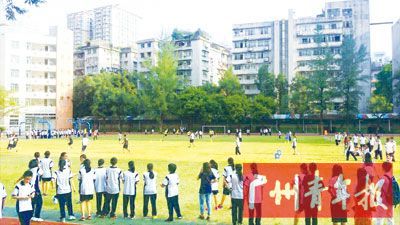 在广州市铁一中学校本部的操场上,球场上至少有5个班级同时上着体育课,在草地上你追我赶踢球的同学不在少数。作为广州市校园足球推广学校,广州市铁一中学根据实际情况,有针对性地开展足球活动,让孩子们增加触球机会,为学生播下了热爱足球的种子。