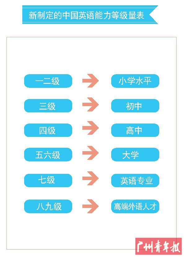 他介绍,新制定的中国英语能力等级量表将划分为九个等级。其中,一二级大致对应小学水平,三级对应初中,四级对应高中,五六级对应大学,七级对应英语专业,八九级对应高端外语人才。每个等级在听说读写、翻译、知识策略等方面,都有不同的要求。