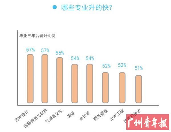 晋升较快的专业排名则和前两份大不相同。艺术设计、国际经济与贸易、汉语言文学位列前三;而在收入、就业率中稳居榜首的计算机科学与技术,则同法学、机械设计制造及其自动化,位居末尾。