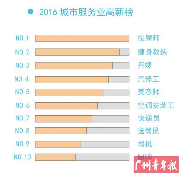 其中位列top10的高薪职位分别为按摩师、健身教练、月嫂、汽修工、美容师、空调安装工、快递员、送餐员、司机、厨师。其中收入最高的按摩师月薪达17669元,而随着健身热席卷,健身教练以15225元的平均月薪位居第二。