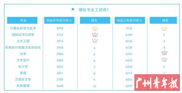 排行榜显示,“计算机科学与技术”无论是在毕业半年后的工资还是毕业三年后的工资都稳居第一。互联网行业的迅猛发展让计算机类专业毕业生成为高薪“贵族”。麦可思分析发现,从事这两大类职业的毕业生主要就读专业均为“软件工程”和“计算机科学与技术”。