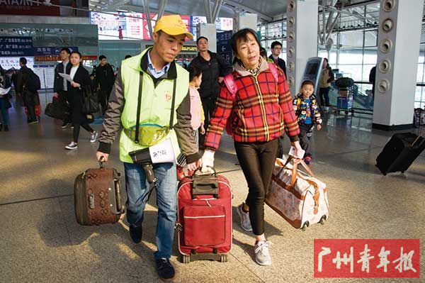在站场周边,广州南站志愿服务队领队唐伟正在带着大家从不同岗位逐个体验。唐伟自2012年就开始在南站做志愿服务,如今已是第六次在南站参与春运服务,被人亲切地叫“唐姨”。帮女儿找年迈的父母、帮爸爸找走丢的孩子、派车接高位截瘫的旅客进站……唐姨告诉记者,志愿者们几乎每天都会遇到类似的事情。“我们做志愿者就是有问必答,有求必应。随时观察,主动去发现问题解决问题。我们每天中午都会集中在一起说说今天有没有发生什么事情,大家互相了解情况,吸取经验。” 唐姨说。