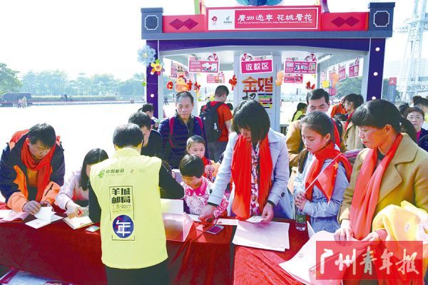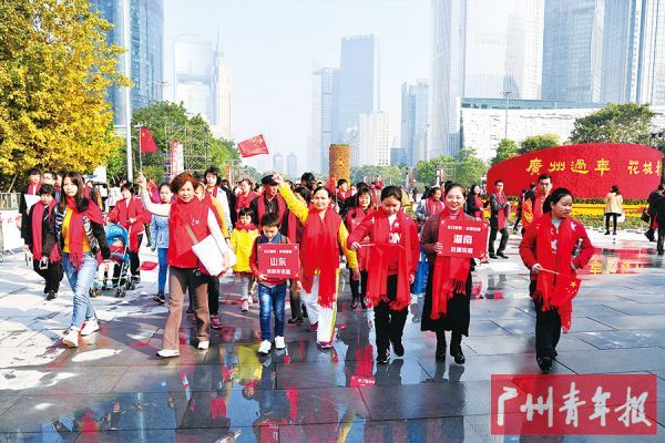 上午9时,“冬日暖阳•来穗团圆”关爱来穗务工青年家庭羊城体验日活动在花城广场举行。20户“团圆”家庭在志愿者的导览下,走进广州的城市客厅——花城广场,了解广州新中轴线标志性建筑的文化及其设计背景。随后,大家来到花城广场志愿驿站,与来自市青联的书法志愿者一同写“福”字和挥春,并派发给游览的市民。