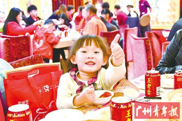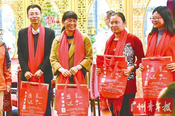 逛完花城广场,20户“团圆”家庭在志愿者的引导下,前往点都德吃团年饭,品尝粤式点心。记者发现,每张餐桌都摆放着主办方为每户家庭准备的“新春福袋”,里面装满各支持单位提供的爱心物资:有腊肠、大米等年货,也有明信片、羊城通、珠江游套票、广州名人蜡像馆门票等礼物。