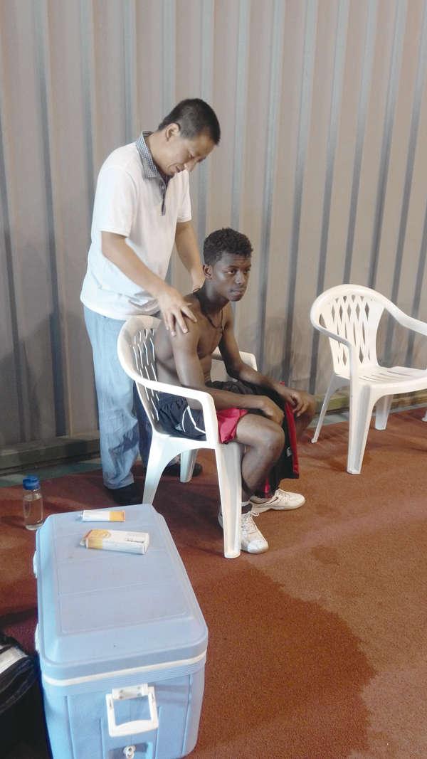 运动医学医生王帅鹗在为运动员提供理疗按摩