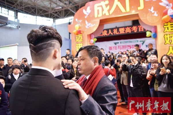 同学们用行动表达信心和决心,而师长们也以各种方式留下真挚的鼓励。2月25日,广州市第四十七中学2017届全体师生、家长齐聚体育馆,约650名高三学子在“成人门”前接受校长彭建平的“三拍肩”祝贺礼:一拍,挑起自己未来人生的重担;二拍,挑起家庭期待的重担;三拍,挑起国家民族的重担。彭校长以一个长者的身份告诉同学们,作为一个成人,要“学会感恩,懂得珍惜,勇于担当。”高考临近,同学们接受彭校长郑重的“成人贺礼”,有着别样的意义。