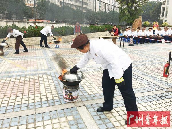 广州市旅游商务职业学校烹饪管理专业的同学们在老师的指导下,小心翼翼地用锅盖盖住起火的油锅。油温没有控制好,在炒菜过程中并不鲜见,当油温达到着火点,偌大的油锅被点燃,巨大的火舌瞬间包裹了油锅,此时的油温高达200摄氏度,如果没有及时扑灭,很容易被油锅烫伤,甚至出现更严重的火情。