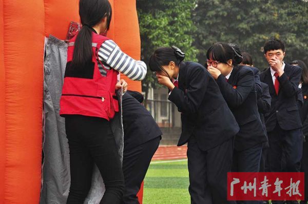 在操场上,广州市旅游商务职业学校旅游管理专业的同学走进专门搭设的“烟道”,在火灾充满浓烟的室内贴地前行。“捂着鼻子还好,时间长了觉得胸闷,一心只想快点走出去,因此大家步伐都很快。”该校职中一年级的江乾霖同学这样形容“烟道”的环境。