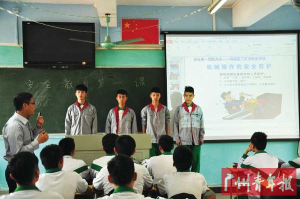 “同学们,请在3分钟内穿好工服,做好‘三紧(袖口紧、下摆紧、裤脚紧)’!”在广州市交通运输职业学校汽车制造与检修班,“安全第一,预防为主”成为了他们的安全教育班会课的主题。据班主任介绍,“‘三紧’虽是小事,但没有做好就会危及生命,走进车间的男生们需要牢记这一点。”
