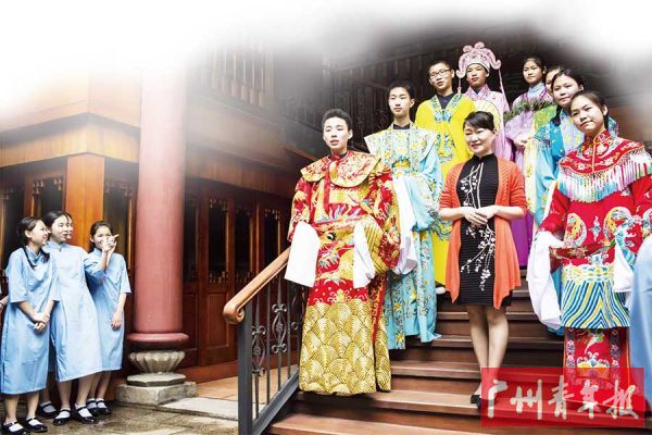 去年4月,广州市长堤真光中学成立了女子书院。在启动仪式上,平日里大大咧咧的“女汉子”们穿上色彩鲜艳的戏服,差点连步子也迈不出去,她们一遍又一遍地练习举起兰花指,渐渐地把自己代入那穿越古代的俏佳人。身高180俊俏男生们,穿着古代皇族服饰,腰杆子挺直再挺直,脑门上细密的汗不断冒出,方才深深体会到“粤剧大老倌们一场戏下来,里三层外三层的衣服都湿透”的滋味。