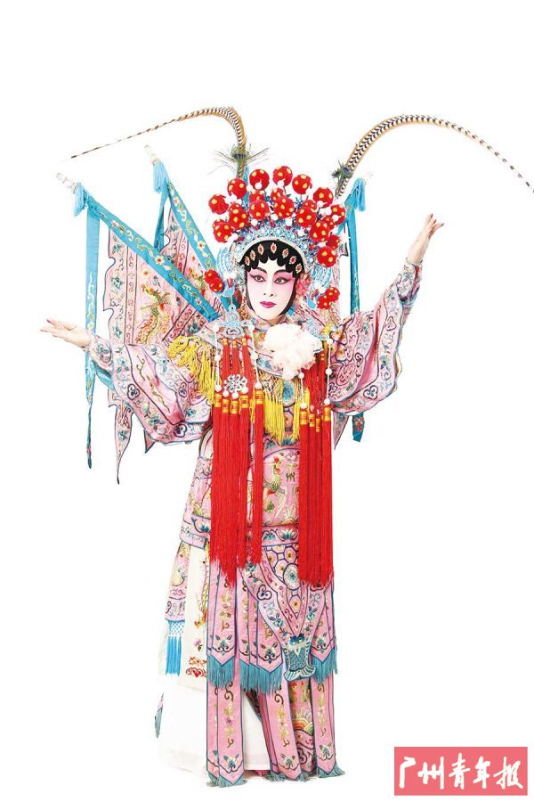 女大靠:是古代出战的女将帅穿用。如粤剧剧目《杨门女将》中的穆桂英,头戴“七星额”,插有雉鸡尾。这种造型的戏服颜色有大红、粉红、湖水蓝等,通常在上面绣凤凰、牡丹,色彩纹样绚丽,衬托出女将的英武形象和阴柔之美。
