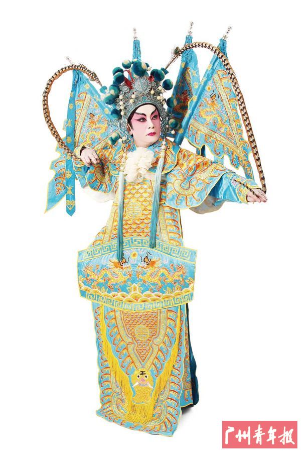男大靠:通常是武生所穿,穿戴时插靠旗,即表示人物全副武装,已处于临战状态。头戴大额子,手拿单头枪,胸前佩戴英雄花球,八面威风。图为著名粤剧剧目《六国大封相》中的造型。