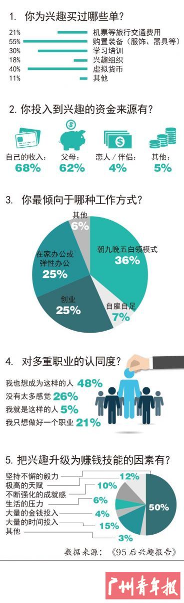 在温锐心中,兴趣和职业并不冲突,重要的是对所从事的职业要有兴趣,这是支撑下去的原动力。《报告》数据显示,在职业选择中,62%的95后把“符合个人兴趣”列在第一位。但在是否把兴趣变成职业这方面,95后有些纠结。一方面,他们很愿意把兴趣培养成一项可以谋生的技能,67%都非常愿意。另一方面,也有一部分95后并不希望把兴趣发展为事业,理由是:变成职业后我就少了一种兴趣了,以及兴趣很难精深,或者是兴趣没有对应的事业。]