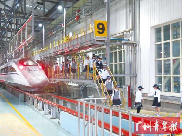 近日,广东华侨中学组织华菁班全体学生到广州动车段组开展研学活动。同学们了解广州动车段建设发展的历程,走进驾车间,实地观摩高铁,还体验高铁驾驶师的严谨操作。空心轴探伤机、五字探伤作业法,6S精细化管理理念……高铁系统枢纽的一切都是那么新奇,同学们大为感叹。