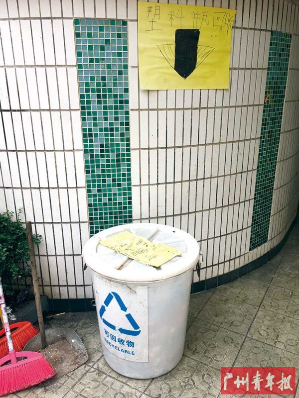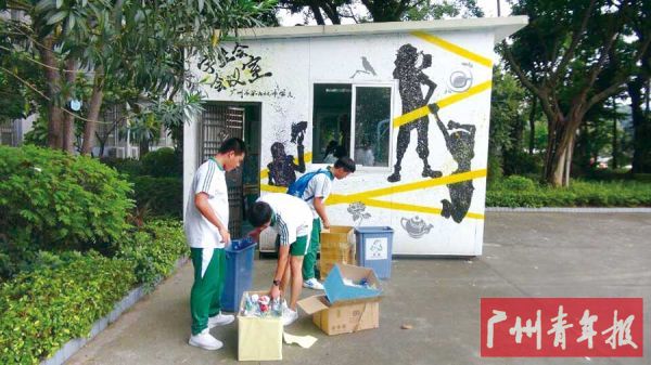 生态委员会要求每个班设置两个回收箱:一个用来装塑料瓶,另一个用来装废纸。生态委员们监督班里同学进行垃圾分类,借此提升同学们垃圾分类的环保意识。当回收箱满了,生态委员将箱内回收物拿到指定地点进行分类投放。校内清洁工定时将塑料瓶和废纸通过一定的回收渠道将其处理,获得回收处理所得的收益。就这样,广州市第九十七中学的校园垃圾分类工作有条不紊地进行着。