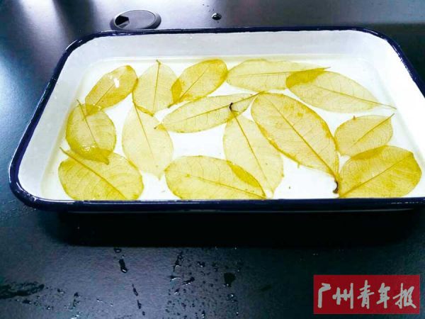 首先,通过浸泡,去除树叶上的叶肉。捡拾老化且强壮的桂花树树叶,用浓度为20%氢氧化钠溶液浸泡,水温要保持90℃~95℃,浸泡时间为15分钟。
