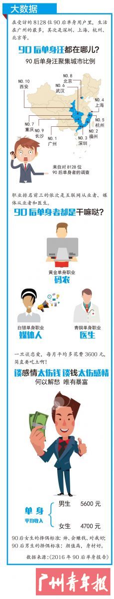单身越来越多,单身的人又有何特点?早前,婚恋平台“MarryU”发布一份《2016年90后单身报告》,在受访的8128位90后单身用户里,生活在广州的最多,其次是深圳、上海、杭州、北京等。在这群人中,所持职业排名前三的依次是互联网从业者、媒体从业者和医生。