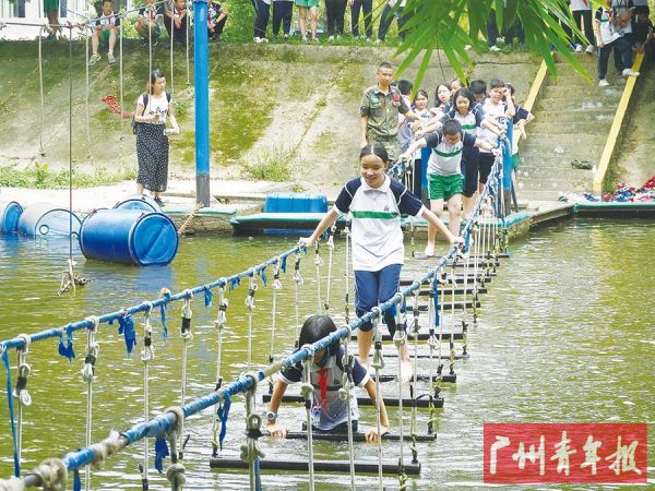 全体师生首先在公园进行6公里的徒步,随后进行拓展活动。各中队队员参加了“珠行万里”、“水上冲关”、“达芬奇密码”和“沙场点兵”等项目体验。看,有的同学敢为人先,他们走独木桥、过绳索、爬轮胎,迅速到达成功的彼岸,高举双手为自己欢呼。在拓展活动中,同学们不仅学会了挑战自我、超越自我,更学会了团结与合作。
