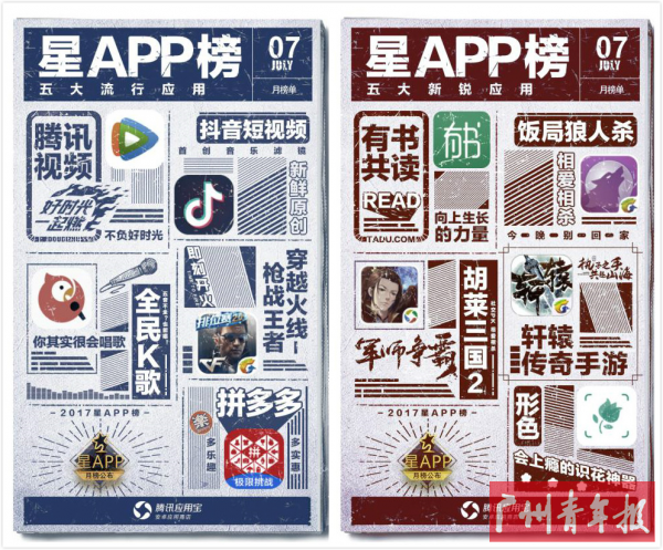 8月17日,腾讯应用宝如期发布了“星APP”7月榜单,“饭局狼人杀”、“形色”、“有书共读”、“胡莱三国2”、“轩辕传奇手游”、“腾讯视频”、“抖音短视频”、“拼多多”、“全民K歌”、“穿越火线-枪战王者”十款APP突围本月移动市场,跻身榜单