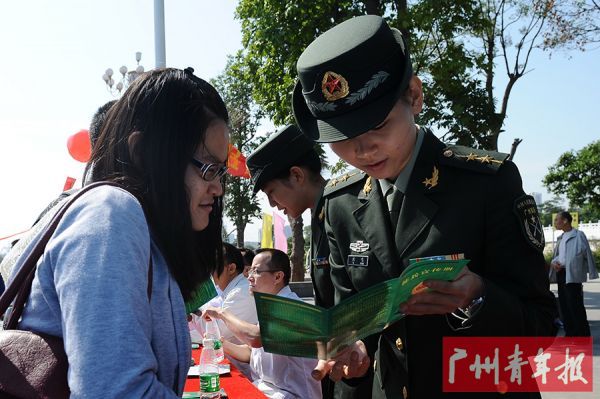 今年,为提高大学生报名应征积极性,广州市征兵办想了很多法子。去全市65 所高校开展“征兵宣传进校园”活动,利用“羊城国防”微信公众号推送最新征兵政策告示等等。为了扩大宣传,越秀区还专门制作征兵宣传片,在广州大学城组织首播仪式,并将宣传片中的原型请到高校与大学生近距离交流,“想用典型,用更能被适龄青年接受的方式宣传征兵工作,让他们对征兵入伍有更大的兴趣、向往”。越秀区征兵办公室工作人员说。