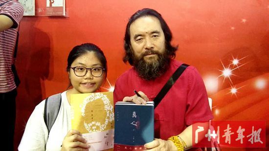 两天后,作家雪漠在书展举行读者见面会暨签售会。当天,我早早来到现场,买好7本书,坐在第一排中间的位置静候。雪漠老师出现了!只见,他身着红色唐装,手缠珠链,满脸络腮胡子,给人一种超脱世俗的感觉。
