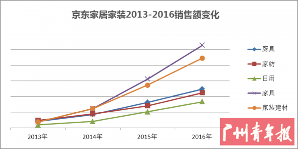 2013年以来,以京东为代表的互联网家居家装行业迎来快速发展,各项数据爆发式增长,2013年-2016年,年复合增长率超过100%。