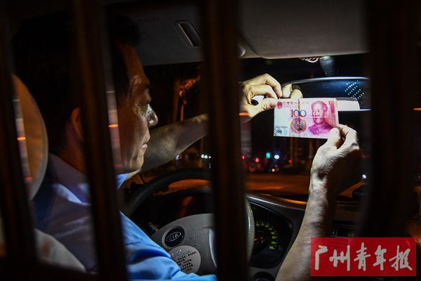 的士司机陈师傅是永州人,来广州已经六年了。这天晚上他把一名客人从北京路送到洛溪新城,由于天色已晚,他在车灯下核对车费的真伪。