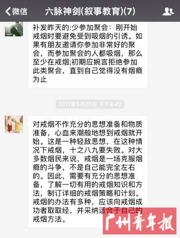我还是没有对他们劈头盖脑地批评或直接给予纪律处分,因为我觉得惩罚不一定可以改变他们的吸烟行为。等大家都进入冷静期,我找到6名吸烟的学生,把他们拉进一个微信群,并起了一个他们喜欢的名字——“六脉神剑”。我定了群规:要在群里说说自己吸烟的经历及吸烟可能带来的危害,还要分享自己戒烟的方法,让他们保持愉快的情绪参与讨论(如下图所示)。