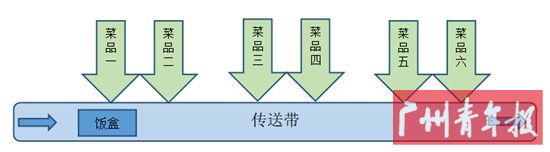 发明亮点:事先收集同学们的用餐喜好,统计好最喜欢的菜式,利用可编程控制的流水线实现配餐过程的自动化,可实现降低沟通时间、精准消费金额、统一消毒卫生安全等目的。